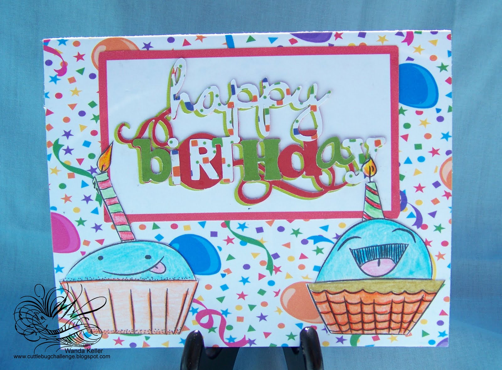 For my Card I used the Happy Birthday phrase from Celebrate with Flourish. It is one of the Walmart Cricut Lite carts. The background confetti is made from my favorite editing programs. I just printed it out and cut to size. My cute little cupcakes are from My Grafico. I colored them with colored pencils.